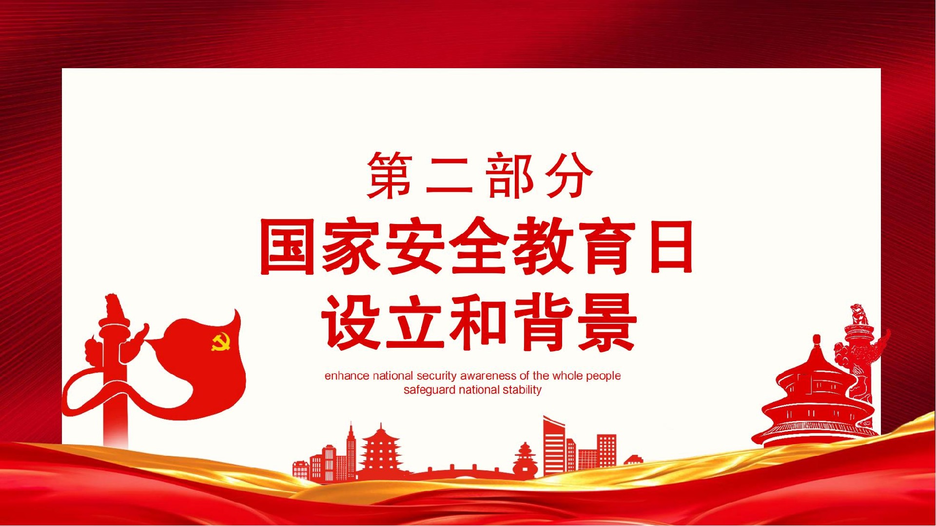 值此第九個全民國家安全教育日來臨之際,作為中國公民,我們更應(yīng)積極加強(qiáng)國家安全教育,國家安全由你我共筑。使關(guān)心國家安全、維護(hù)國家安全成為思想共識和行動自覺。