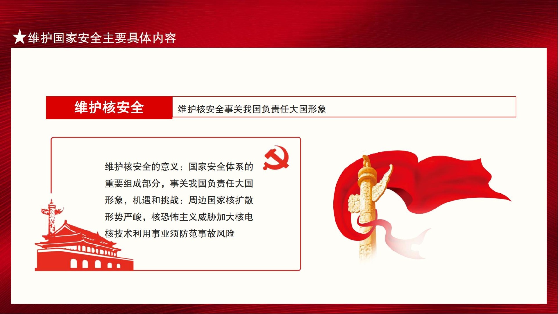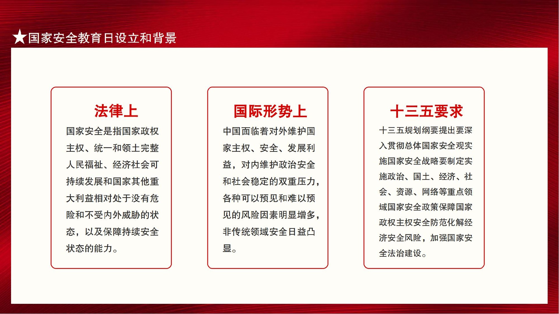 值此第九個全民國家安全教育日來臨之際,作為中國公民,我們更應(yīng)積極加強(qiáng)國家安全教育,國家安全由你我共筑。使關(guān)心國家安全、維護(hù)國家安全成為思想共識和行動自覺。