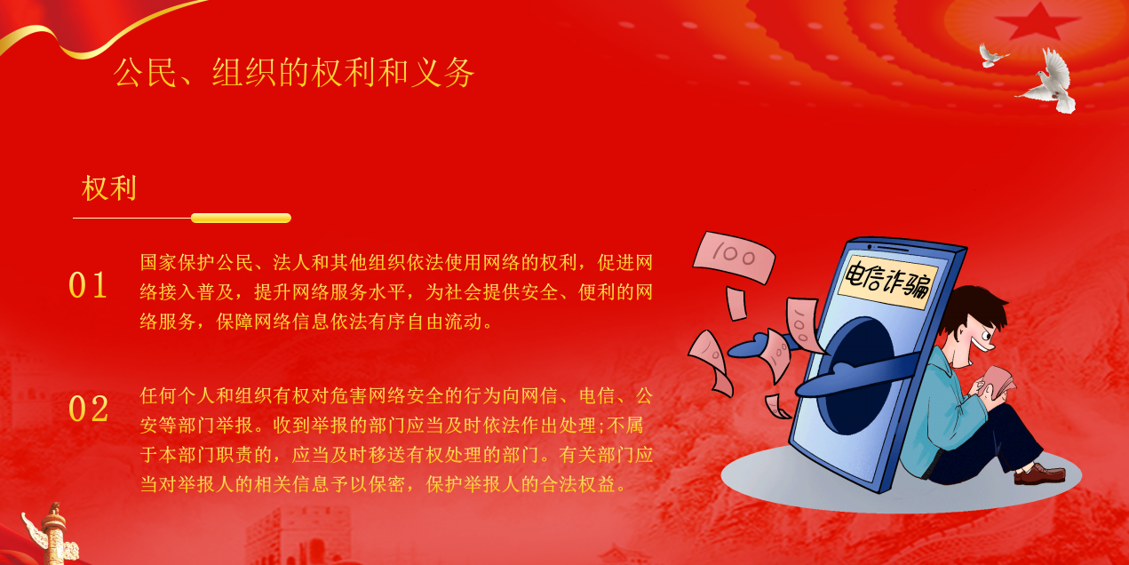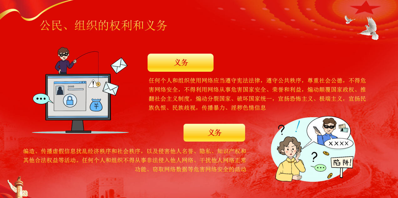 在網(wǎng)絡(luò)安全保障體系中,公民與組織依法享有的權(quán)利可分為"積極權(quán)利"與"消極權(quán)利"兩大維度,這兩類權(quán)利共同構(gòu)筑了網(wǎng)絡(luò)空間的權(quán)益保護(hù)網(wǎng)。網(wǎng)絡(luò)安全不是某一個(gè)人的事,而是我們每個(gè)人都要守護(hù)的共同責(zé)任。作為公民和組織,在網(wǎng)絡(luò)空間里該怎么做、不該怎么做,其實(shí)有著清晰的“行為指南”。我們可以把這些責(zé)任分成三個(gè)層面來(lái)記:首先是必須守住的“底線義務(wù)”,其次是絕對(duì)不能碰的“禁止行為”,最后是千萬(wàn)別忽視的“協(xié)助責(zé)任”。